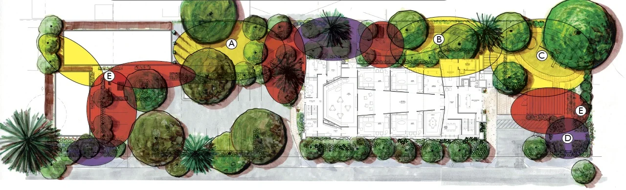 With the recognition that an important part of trauma recovery is regaining a sense of optimism, the aesthetics of the outdoor spaces emphasize joy through curvilinear spaces, spherical and rounded forms, and materials and spaces which create a sense of abundance, lightness, and clarity. Kids and families growing their own food encourages a positive self-image, a sense of resourcefulness, supported by connection with the bounty, beauty, and healing power of the natural environment.